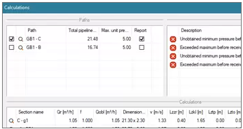 • A geração de relatórios de cálculo contendo perdas de gás seccional em seções de desenho individual, com possibilidade de ajuste dos diâmetros das seções.